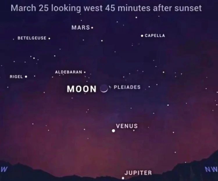 28 марта 2023 года над горизонтом в линию выстроятся Меркурий и Юпитер, чуть выше – Венера, недалеко от Луны – Марс; компанию им составит и далёкий Уран, но его можно будет наблюдать только в телескоп, пусть даже любительский, чуть левее Венеры.